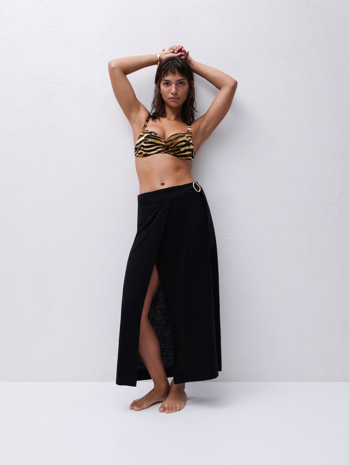 Alba är en elegant långkjol i linne med sofistikerade snitt och ett luftigt fall. Lätt och följsam kombinerar den en chic men avslappnad känsla, perfekt att bära över badkläder och lika självklar för en promenad längs strandpromenaden.