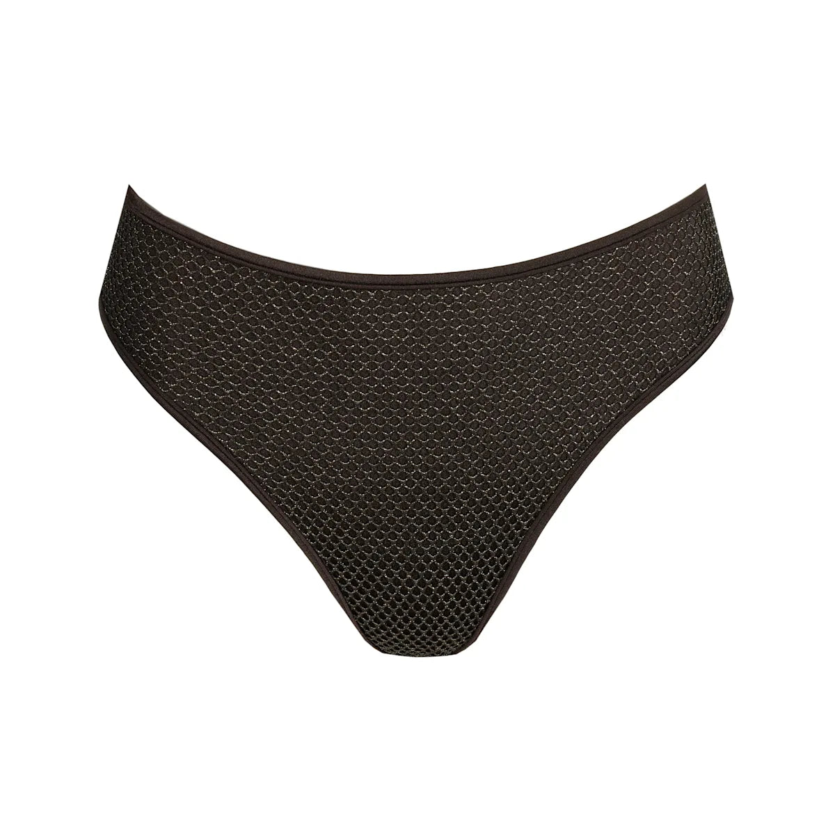 Sarda Swim Janja Bikini Full Briefs i skimrande lurex-mesh som fångar ljuset från alla vinklar och ger en exklusiv, nästan smyckeslik effekt mot huden. Den djupa chokladbruna tonen förstärker känslan av värme och exklusivitet.