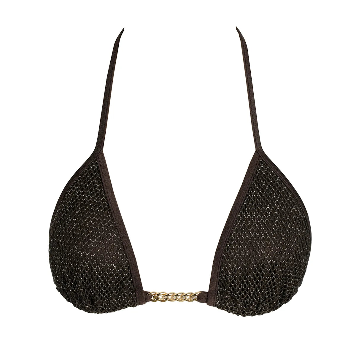 Sarda Swim Janja Mini Triangle Bikini Top är tillverkad i glittrande lurex-mesh som fångar ljuset i varje rörelse och ger en subtil, lyxig lyster mot huden. Den djupa chokladbruna tonen förstärker känslan av värme och exklusivitet.