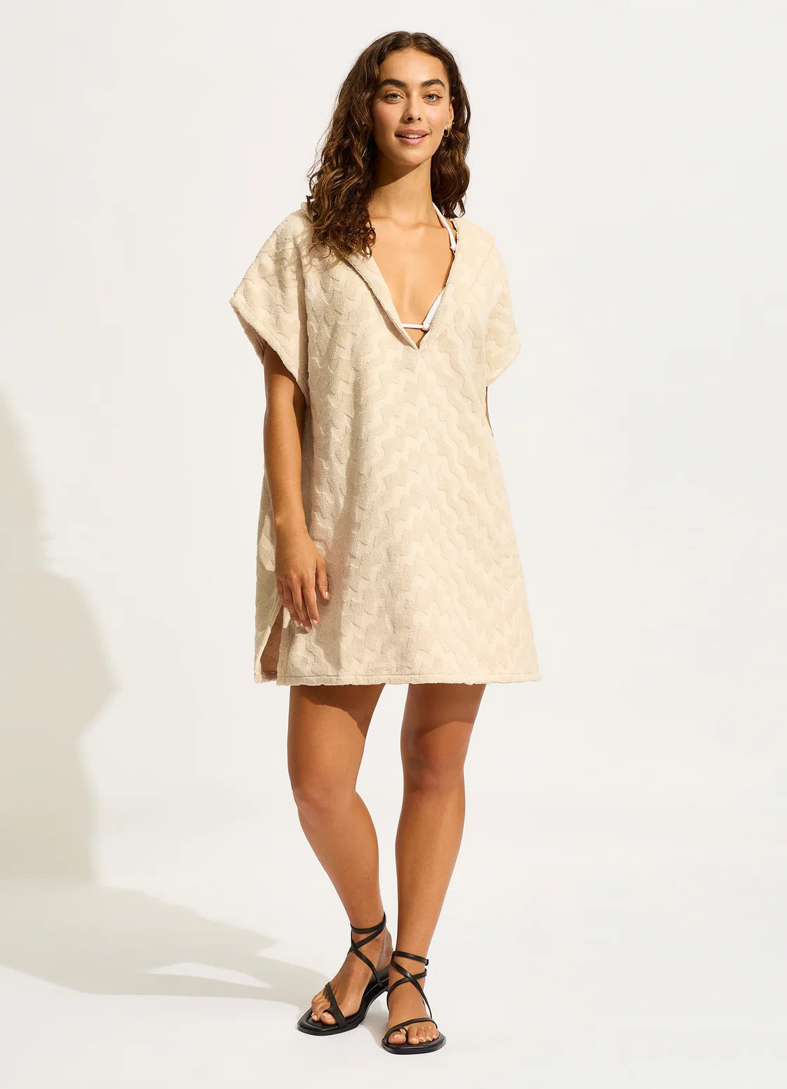 Seafolly Towel Poncho är en avslappnad och stilren poncho i mjuk frotté – perfekt att dra över bikinin efter ett dopp. Den luftiga modellen med V-ringning och korta ärmar gör den både bekväm och enkel att bära på stranden, vid poolen eller på väg till lunch.
