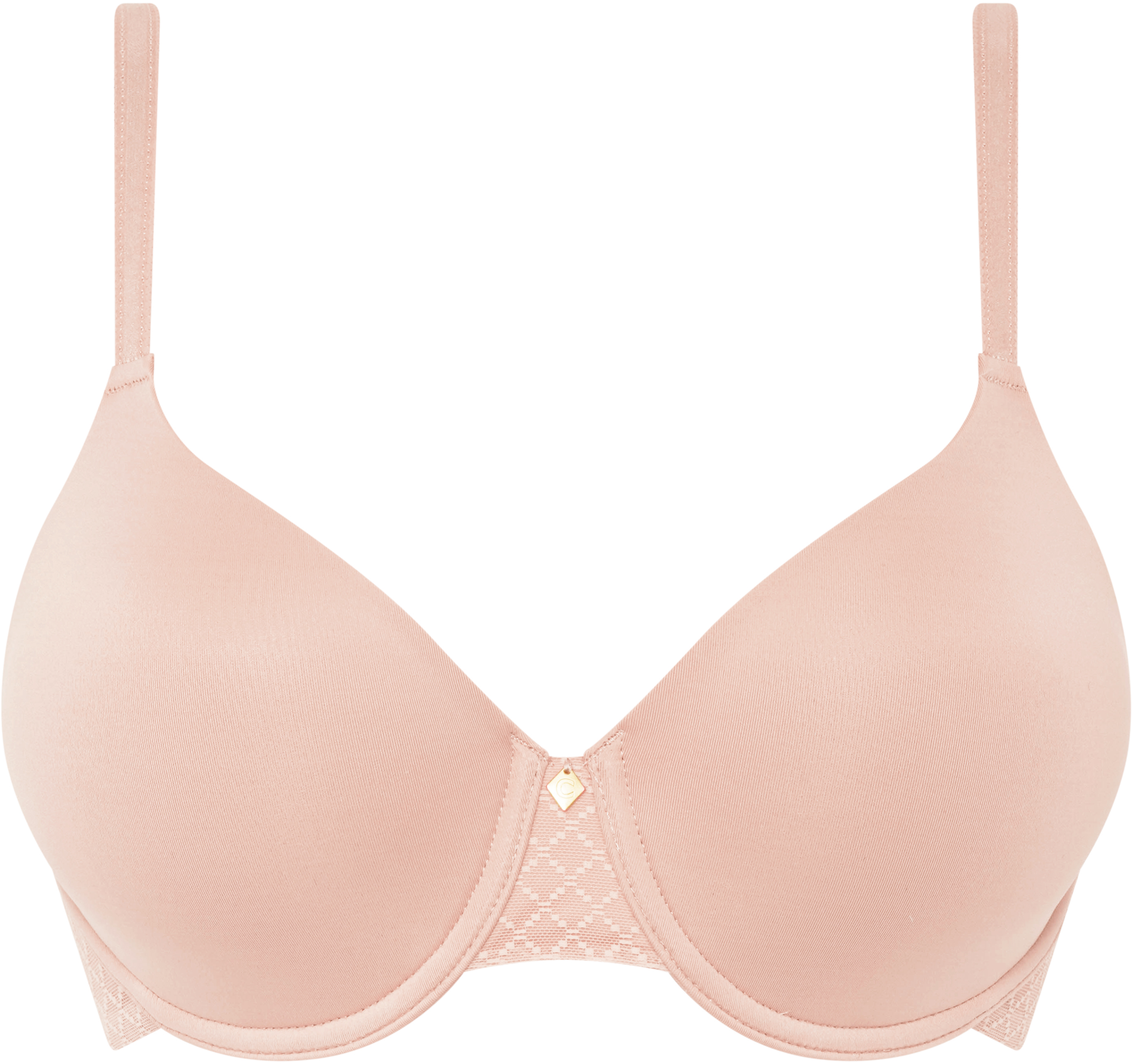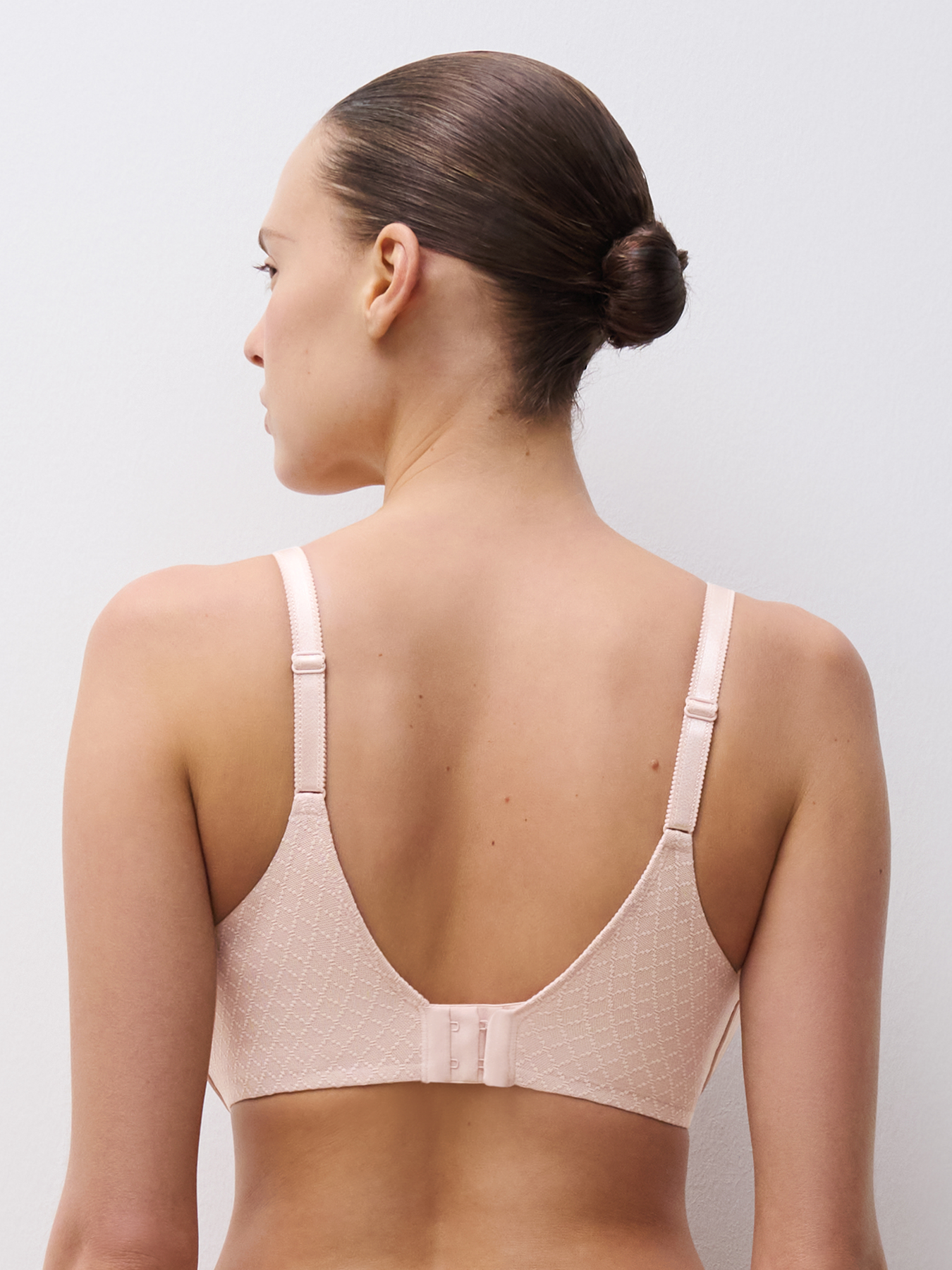 De vadderade bygelkuporna ger en rund, naturlig form och en helt slät silhuett under kläderna. Den mjukt fodrade ryggen i mesh gör att bh:n sitter stabilt utan att kännas tung, och de justerbara axelbanden ger en bekväm passform hela dagen. Mellan kuporna sitter ett litet C-smycke som lyfter designen på ett subtilt sätt.