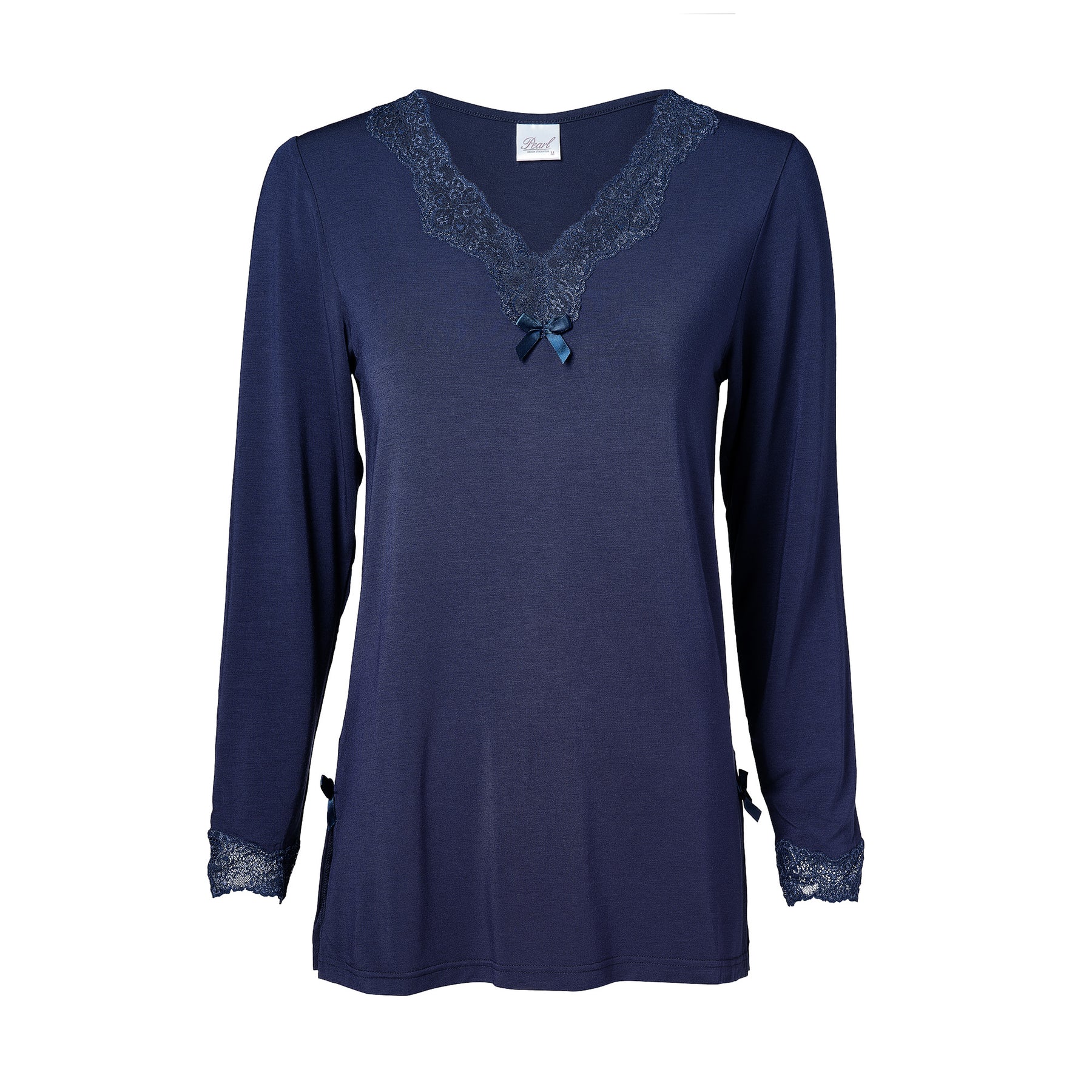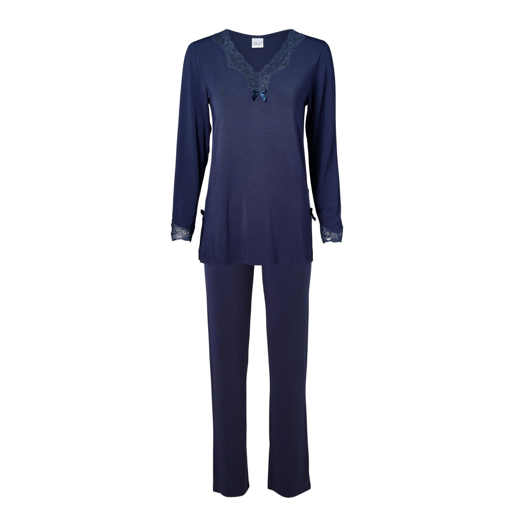 Den långärmade toppen har spetsdetaljer vid halsringning och ärmslut, samt 14 cm sidslitsar som ger extra rörelsefrihet och en elegant siluett. Byxorna har rak passform och en mjuk resår i midjan för en följsam och avslappnad känsla hela natten – och hela dagen, om du vill.