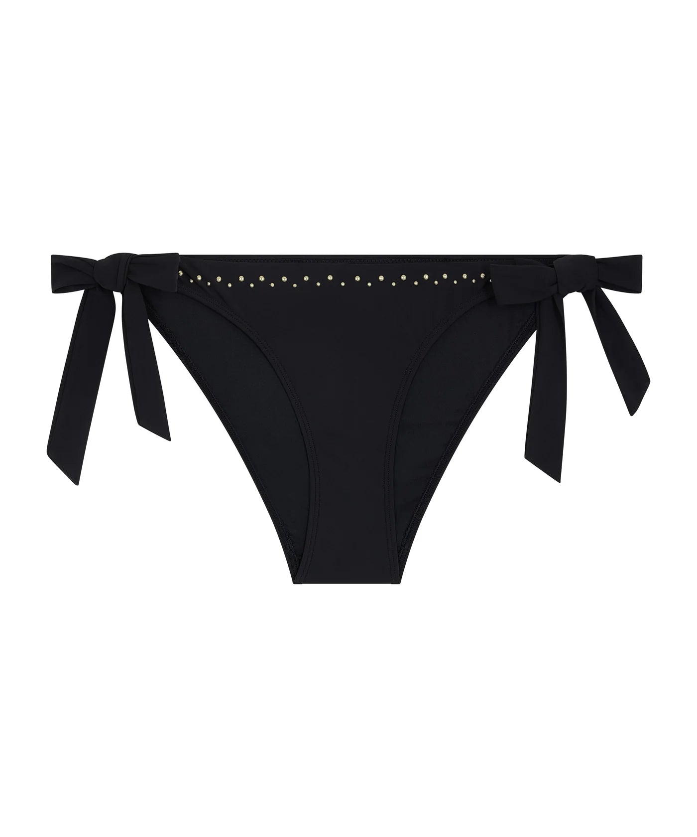 Bikinitrosan har justerbara knytband i sidorna och en smickrande skärning som framhäver höfter och ben. Det släta materialet med matt finish kombineras med guldfärgade studs längs linningen som fångar ljuset och ger modellen en trendig och exklusiv känsla.