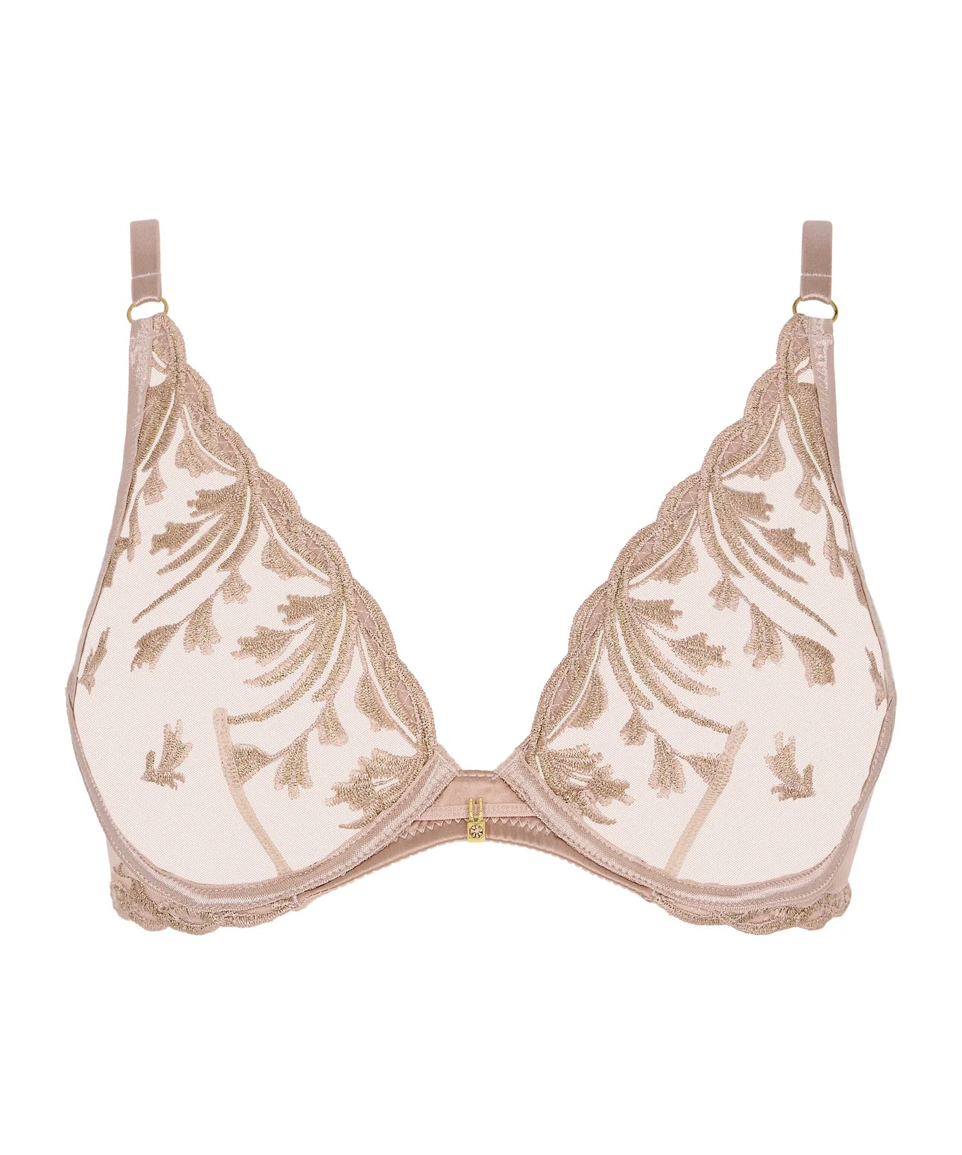 Aubade Cosmic Romance Underwired Triangle Bra är en sensuell och elegant triangelformad bh som kombinerar ett naturligt lyft med Aubades karakteristiska förföriska uttryck. Den bygelförsedda plunge-modellen skapar en vacker urringning och ger lätt stöd, samtidigt som den transparenta och exklusiva brodyren låter huden skimra igenom på ett sofistikerat sätt. Mellan kuporna sitter en liten guldfärgad detalj som adderar en diskret men lyxig finish.