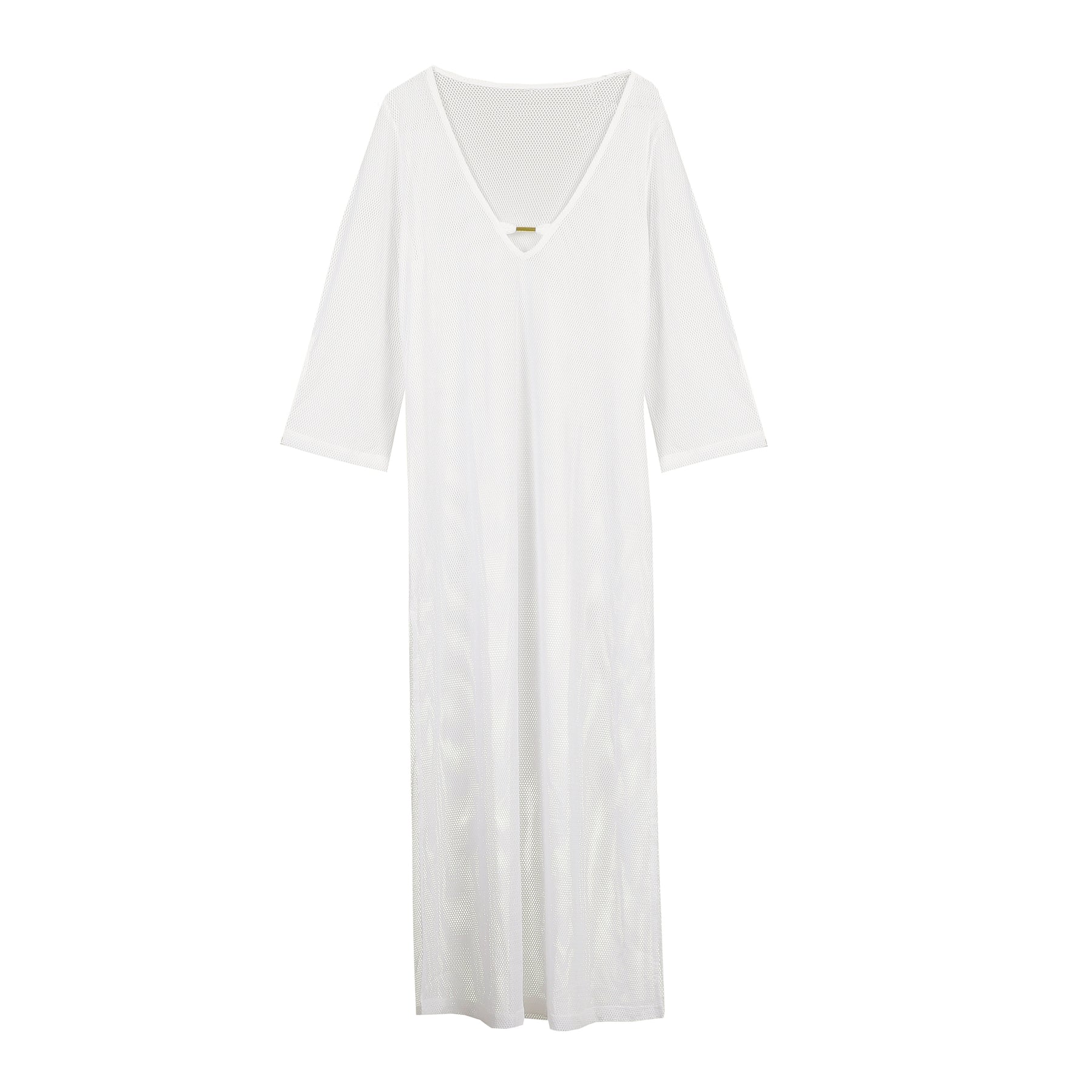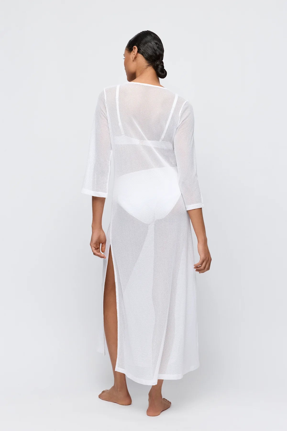 Den djupa V-ringningen framtill ger ett feminint uttryck, medan de trekvartslånga ärmarna och den generösa längden skapar rörelse och lätthet i varje steg. Elfin White förstärker känslan av fräsch minimalism och lyfter solkysst hud med en tidlös, sofistikerad ton. Ett plagg som är lika rätt över bikinin på stranden som stylad med sandaler på väg mot lunch i solen.