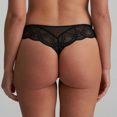 Thong från Marie Jo's serie Cathia. Förföriska stringtrosor med en svårslagen passform; den här stringtrosan erbjuder det bästa av två världar. Den är högre skuren vid benet. Förföriska med en antydan av mystik och alltid i trend med sin svarta nyans - alltid lika stilren!